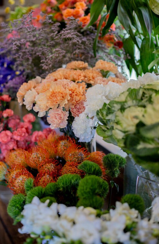 Des fleurs de toutes les couleurs, des feuillages ainsi que de jolis contenants et objets déco.